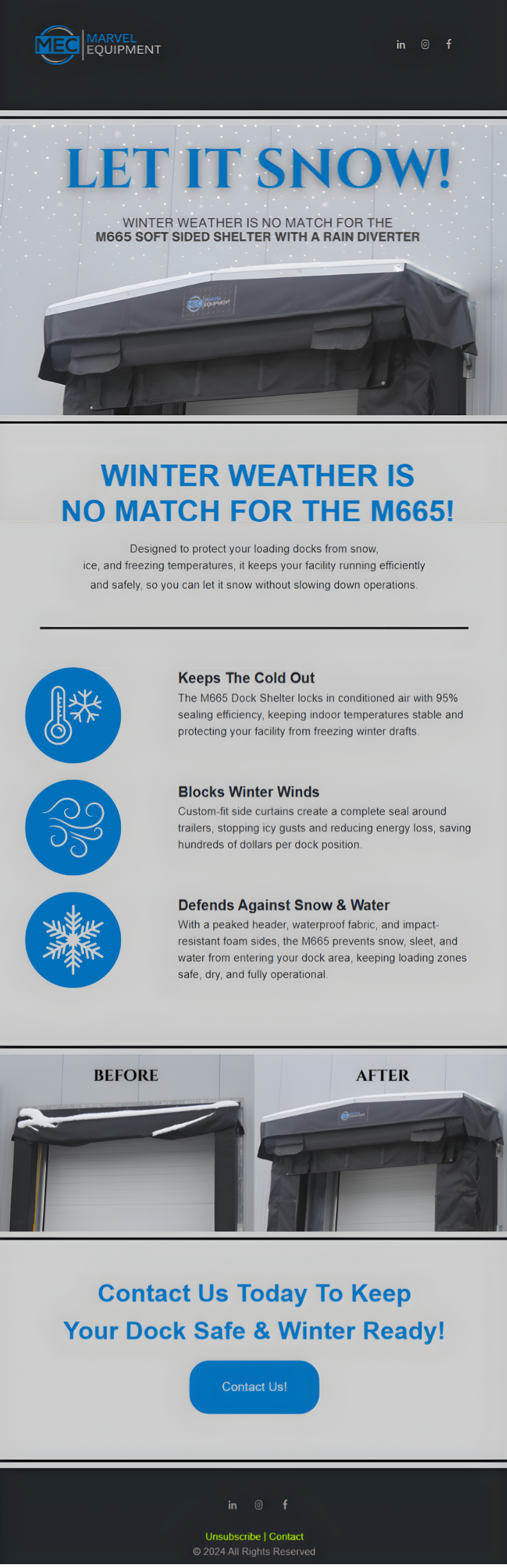 The Let It Snow campaign followed a multi-channel, organic strategy to engage both existing customers and new audiences. LinkedIn delivered industry-focused messaging, while Instagram showcased seasonal visuals and product highlights. The website served as a central hub for deeper content, and targeted email marketing reinforced product value with before-and-after installation visuals. By leveraging organic channels, the campaign fostered authentic engagement, strengthened brand trust, and showcased Marvel Equipment’s commitment to delivering reliable dock shelter solutions.
